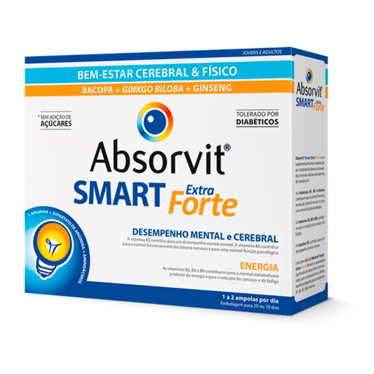 ABSORVIT® SMART EXTRA FORTE é um tónico cerebral e físico. Estáindicado para pessoas ativas, em situações de maior esforço intelectuale físico, e que necessitam de um aporte “extra” de energia.