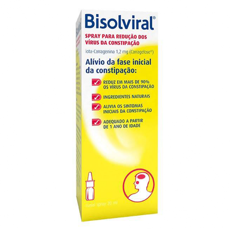 Spray que reduz em mais de 90% os vírus da constipação. Bisolviral® para o alívio da fase inicial da constipação. - As constipações são causadas por vírus, sendo o nariz a principal porta de entrada para os vírus da constipação comum que entram no organismo. - Bisolviral® é um spray que forma uma suave camada protetora, para ajudar a impedir que os vírus da constipação se multipliquem e se alastrem. Pode também ser utilizado para ajudar a hidratar as fossas nasais. Bisolviral® ajuda a reforçar as defesas naturais do corpo contra a constipação comum, incluindo infeções virais do nariz e da garganta, especialmente na fase inicial. Clinicamente comprovado. Adultos e crianças com mais de 1 ano: Uma pulverização em cada narina, pelo menos, 3x/dia.