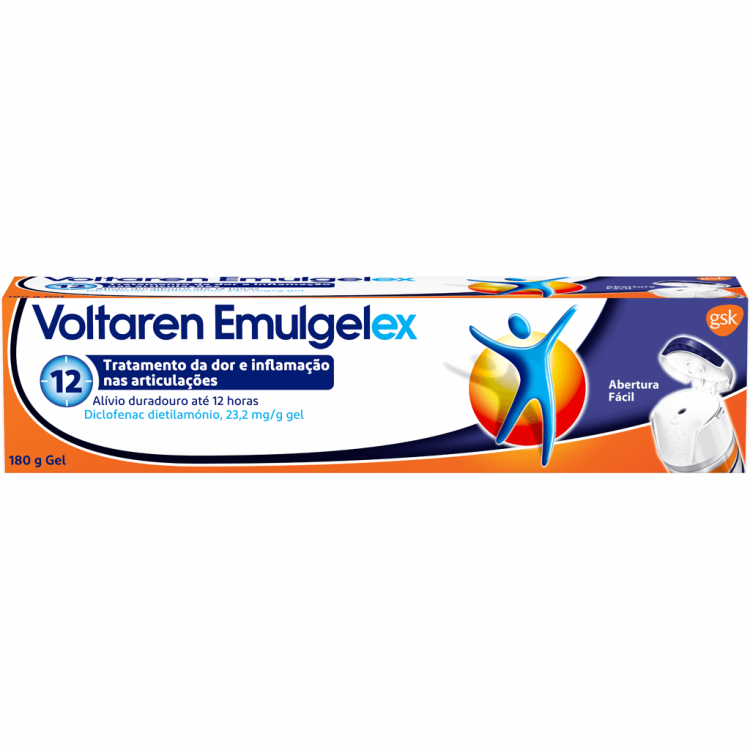 Voltaren Emulgelex 180g, com uma nova abertura fácil que pemite facilidade na utilização e com um design ergonómico mais intuitivo, é um medicamento não sujeito a receita médica, que atua na zona afetada, aliviando a dor e reduzindo a inflamação. Penetra em profundidade na pele com o dobro da concentração*, proporcionando um alívio prolongado da dor até 12 horas. *Comparado com Voltaren Emulgel Adultos e adolescentes com idade igual ou superior a 14 anos. Aplicar 2 vezes ao dia (de manhã e à noite) na área dolorosa uma quantidade aproximadamente entre o tamanho de uma cereja e uma noz. Efeito refrescante enquanto massaja com o gel. Antes da primeira utilização, utilize o lado contrário da tampa para inserir, torcer e remover o selo da bisnaga. Pode ser utilizado até 14 ou 21 dias, dependendo da indicação. Se a dor piorar ou não melhorar após 7 dias, deverá consultar um médico.